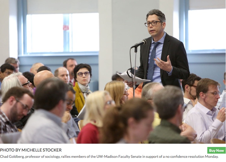 Brock Read, “U. of Wisconsin at Madison Faculty Votes No Confidence in System’s President and Regents,” Chronicle of Higher Education, May 2, 2016